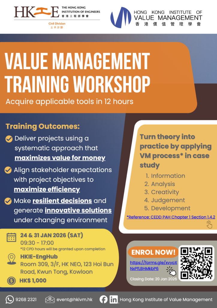 People are engaged in cost reduction exercise in their everyday business and leisure. People may also spend a huge sum of money on something they like at first sight without evaluating the real needs and comparing with the function to price ratios with other alternatives. Value management (VM) techniques help people analyse their needs in a systematic manner and find options giving more values for the same or lower price. Nowadays, architectural, engineering, surveying and construction professionals should not only acquire their cognate technical knowledge. Additional management skills are also necessary to make them successful. VM techniques are definitely one of these skills widely adopted in order to achieve excellence in various disciplines particularly in construction, engineering and industrial projects as well as in daily life. This training workshop would help you understand and master the techniques and apply value management in your everyday business and leisure.